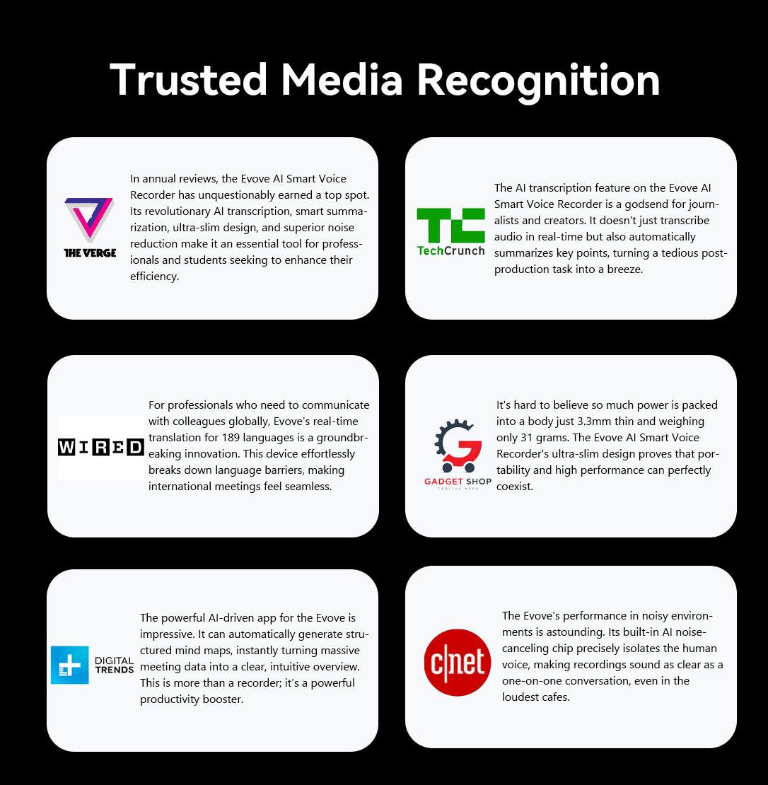 With its powerful AI features and ultra-portable design, the Evove AI Smart Voice Recorder offers a more efficient and clearer way to capture information.